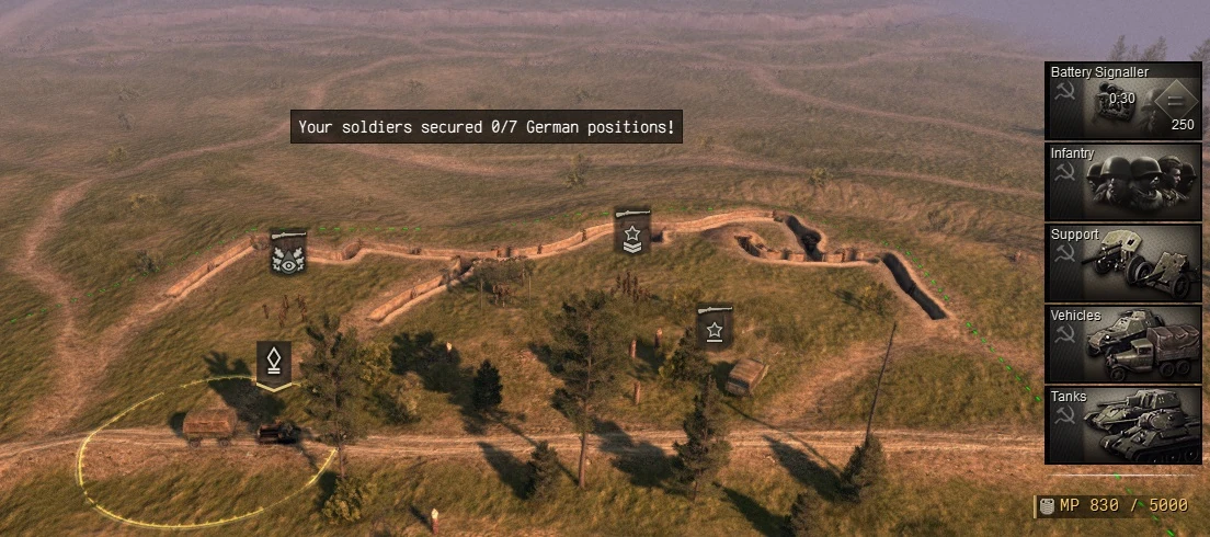 The primary objective in Soviet skirmish missions is to capture and hold seven control points (CPs). Each CP (except for the final victory point) unlocks additional reinforcements.
